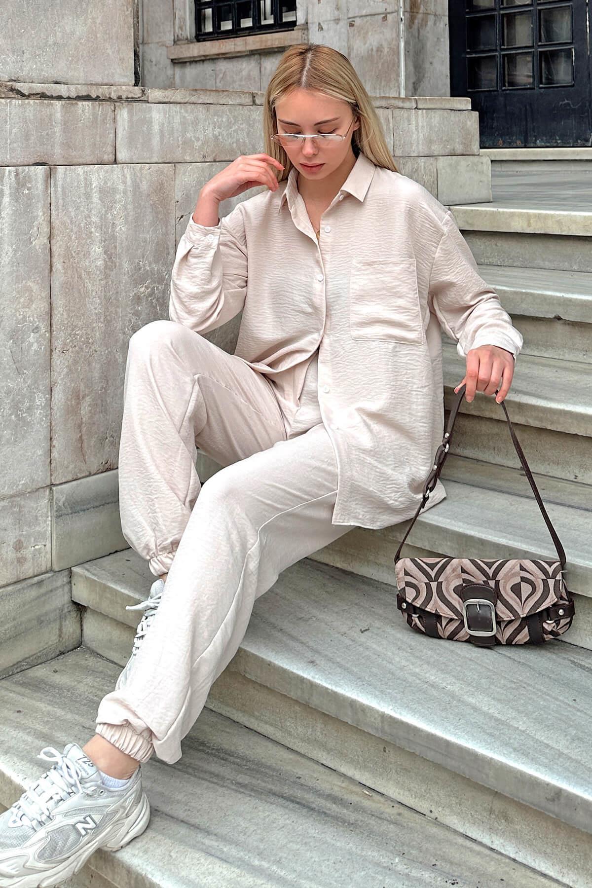 Swist Bej Paça Lastikli Tek Cep Gömlek-Pantolon Alt-Üst Kadın Takım