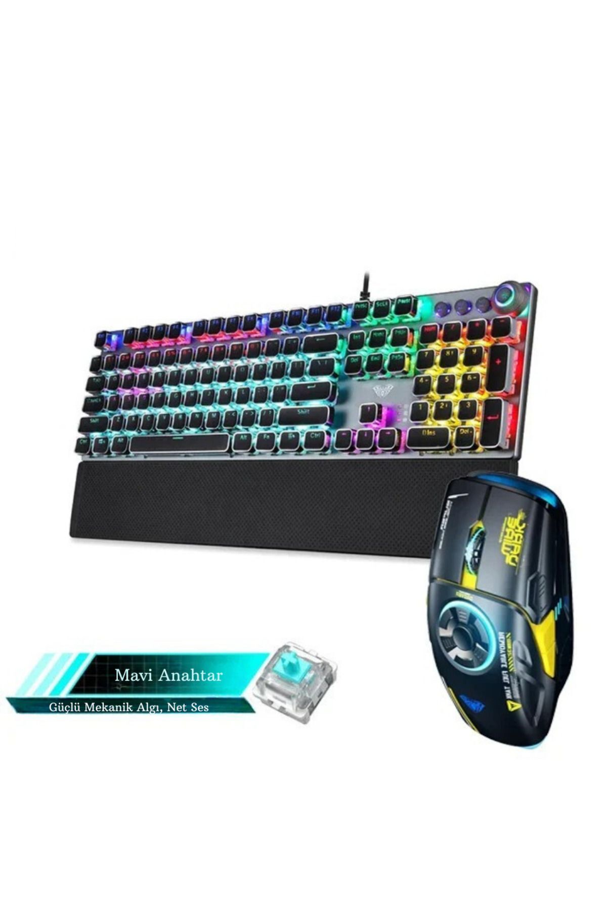 TechTic Mekanik Klavye Mouse Seti Kablolu Klavye 2.4G Mouse RGB Bilek Desteği Daktilo Klavye Retro