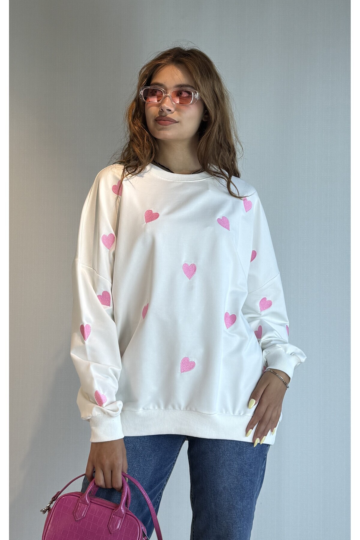 TF The Fancy For You Kadın Bisiklet Yaka Kalp Desenli Oversize Uzun Kollu Sweatsirt