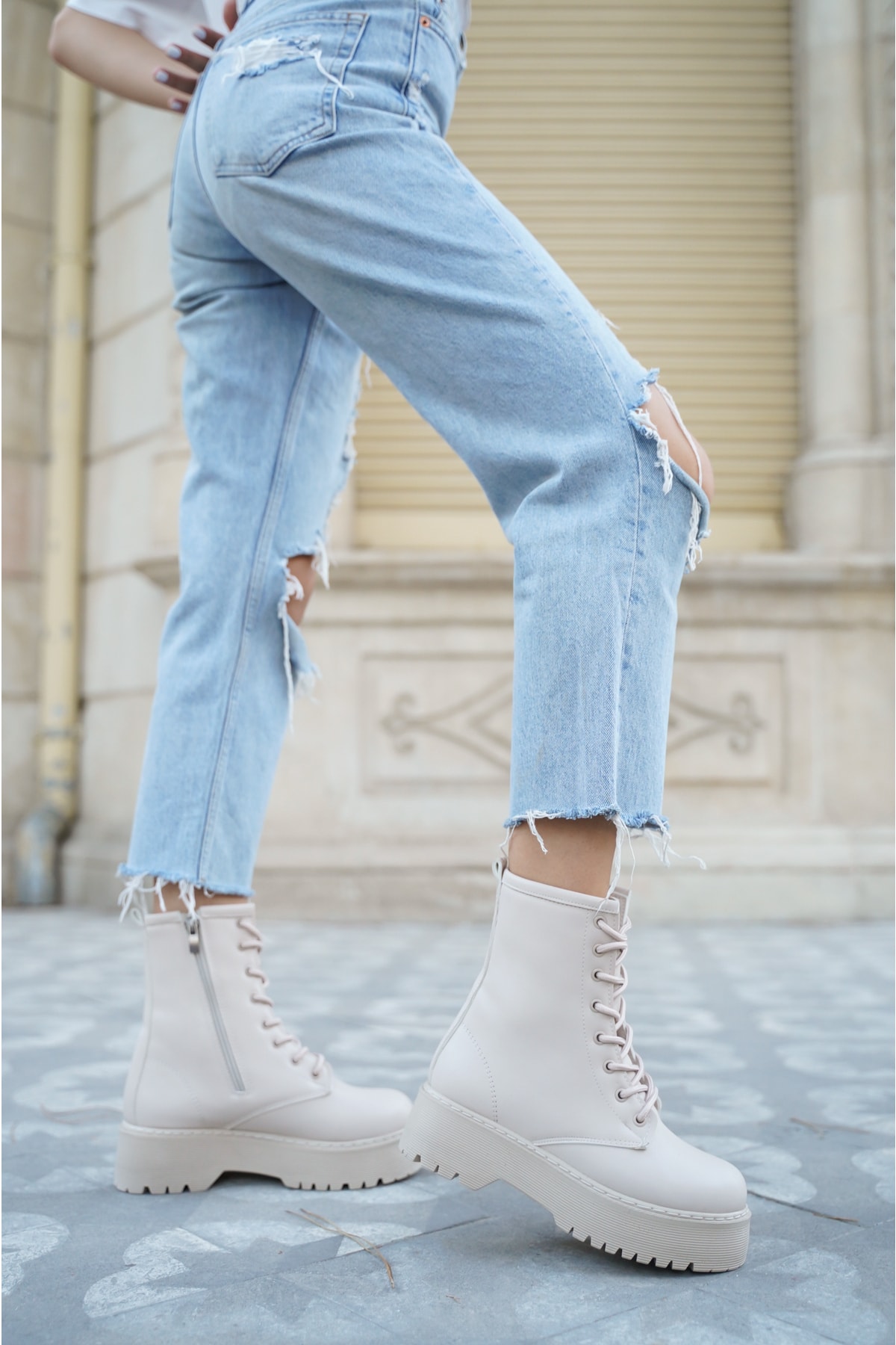 TOPUK Adda Kadın Ten Bağcıklı Kalın Tabanlı Bootie