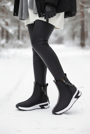 Solo Bag Kadın Yeni Sezon Kalın Taban Lastikli Önden Fermuar Detaylı Siyah Günlük Rahat Kalıp Streç Çizme