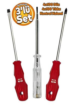 ELDİPA 3 Parça Tornavida Seti - 4x100mm Yıldız ve Düz Uç - Kontrol Kalemi - Profesyonel Set - Hem Ev Hem İş