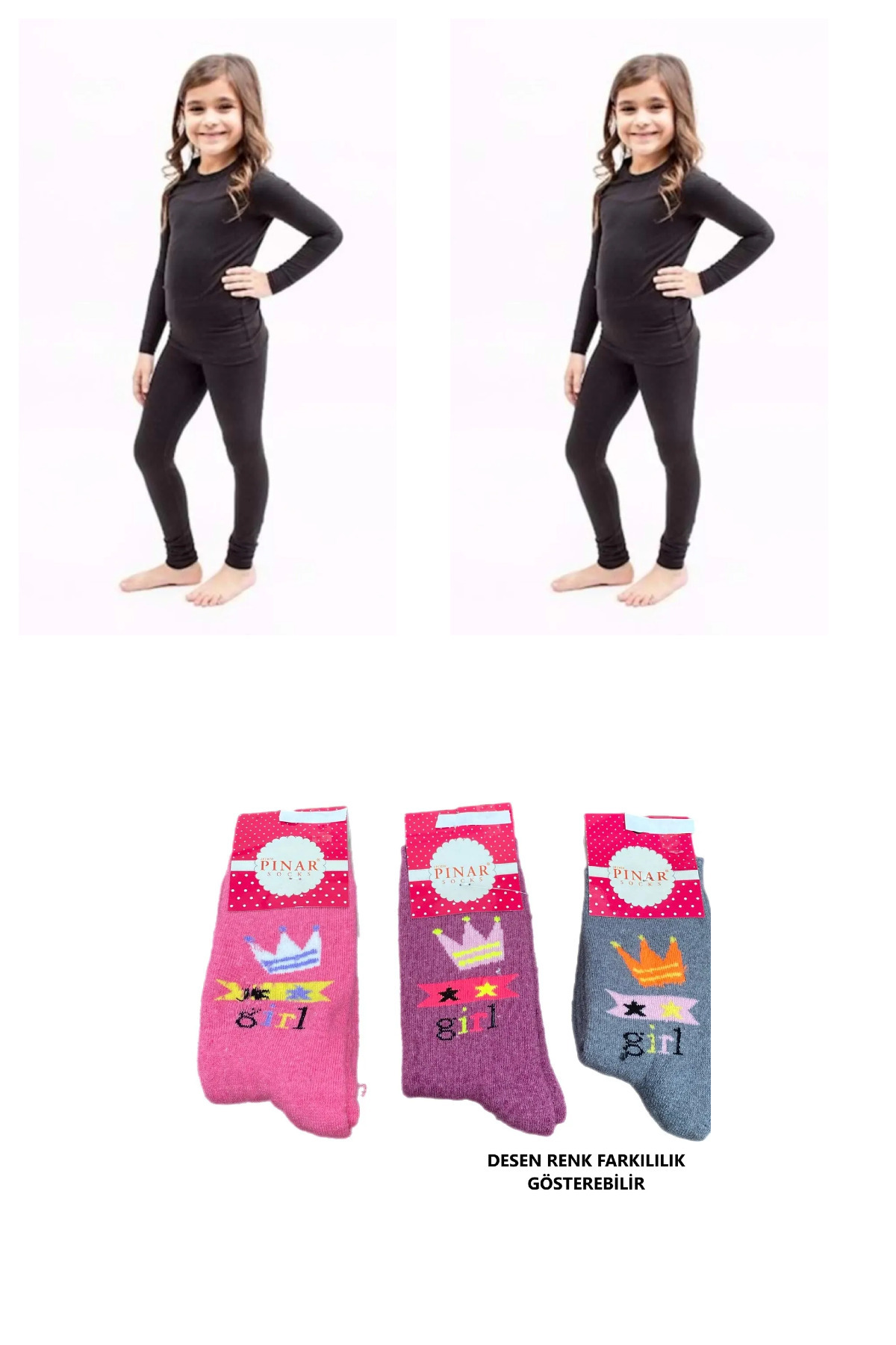 Tutku Kız Çocuk 2 Adet Termal Alt- 2 Adet Üst Set Takım Siyah 3 adet kışlık çorap
