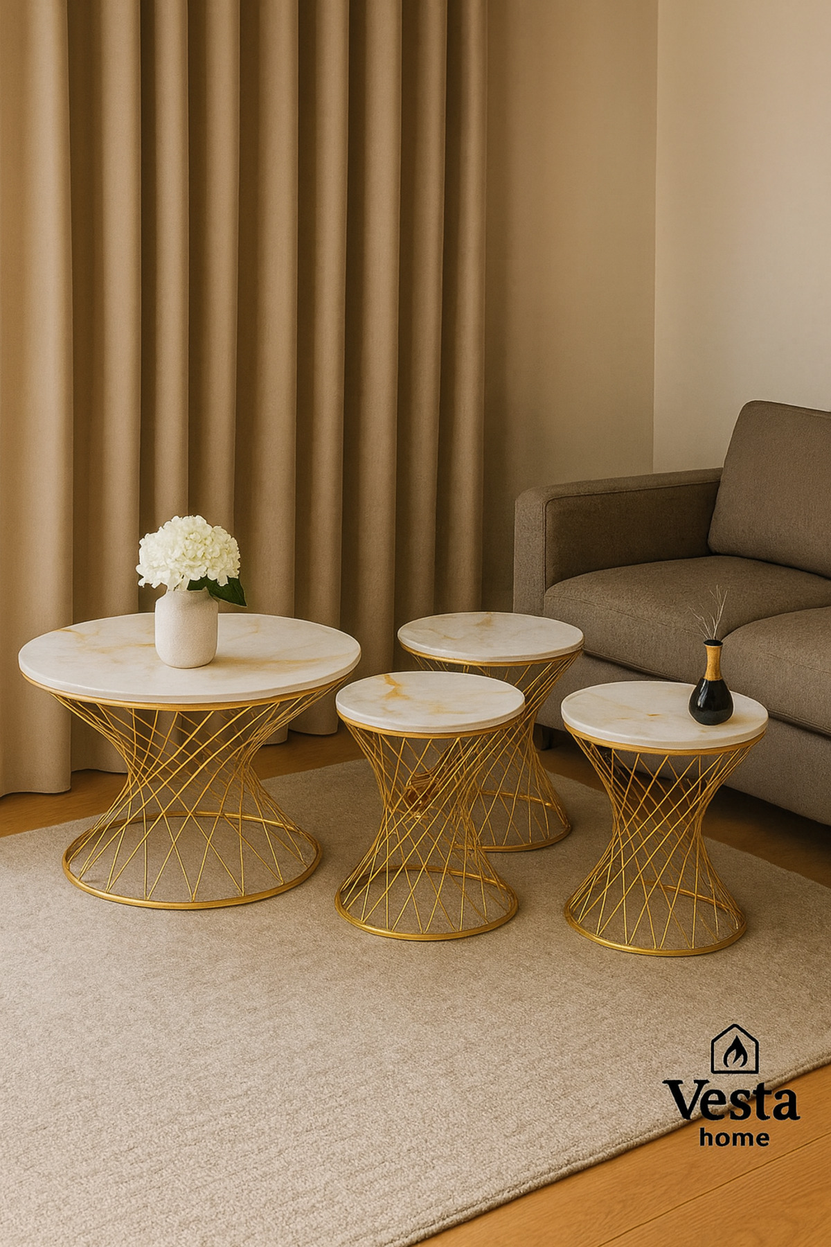 Vesta Home Saati zigon sehpa takımı Sarı Mermer Desenli Cam Hasır Kum