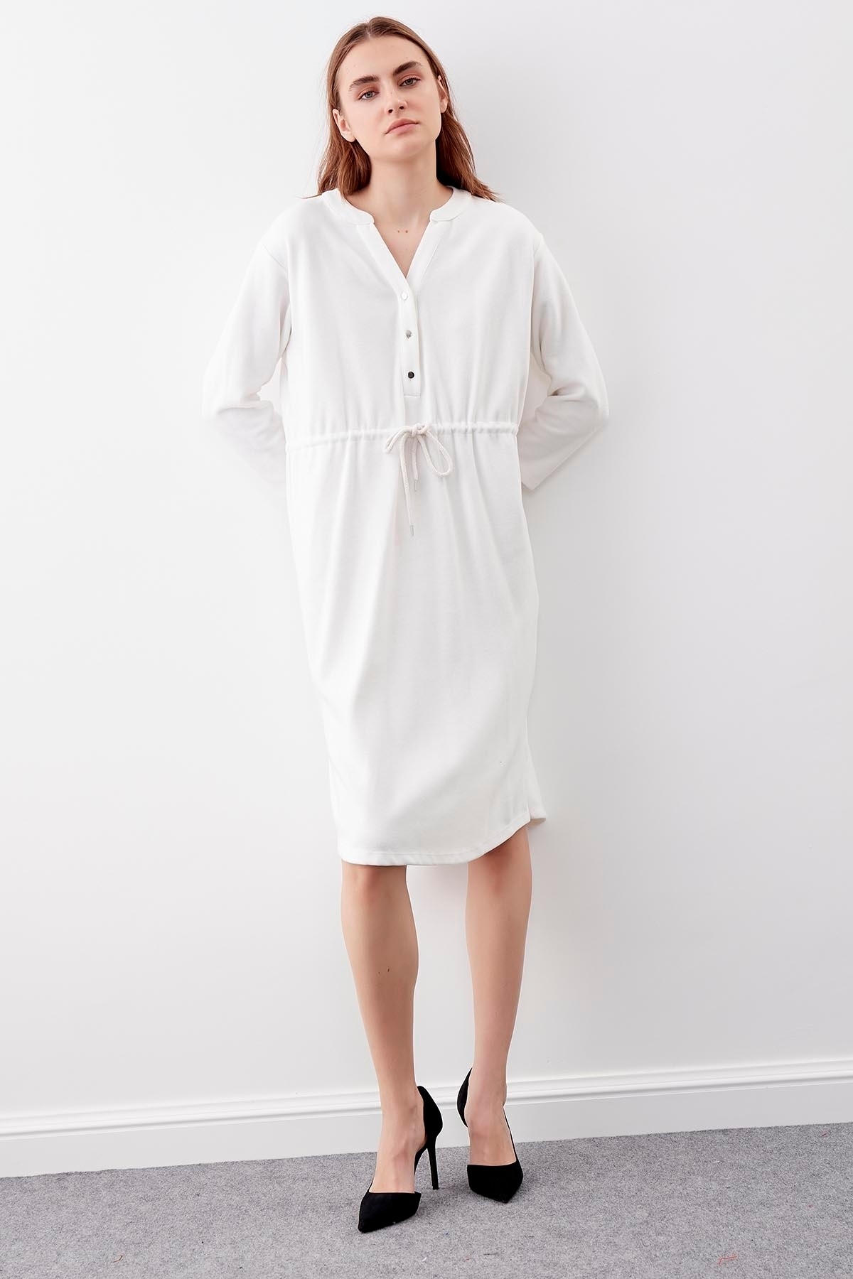Vitrin Düğmeli Beli Büzgülü Örme Elbise Özellikleri