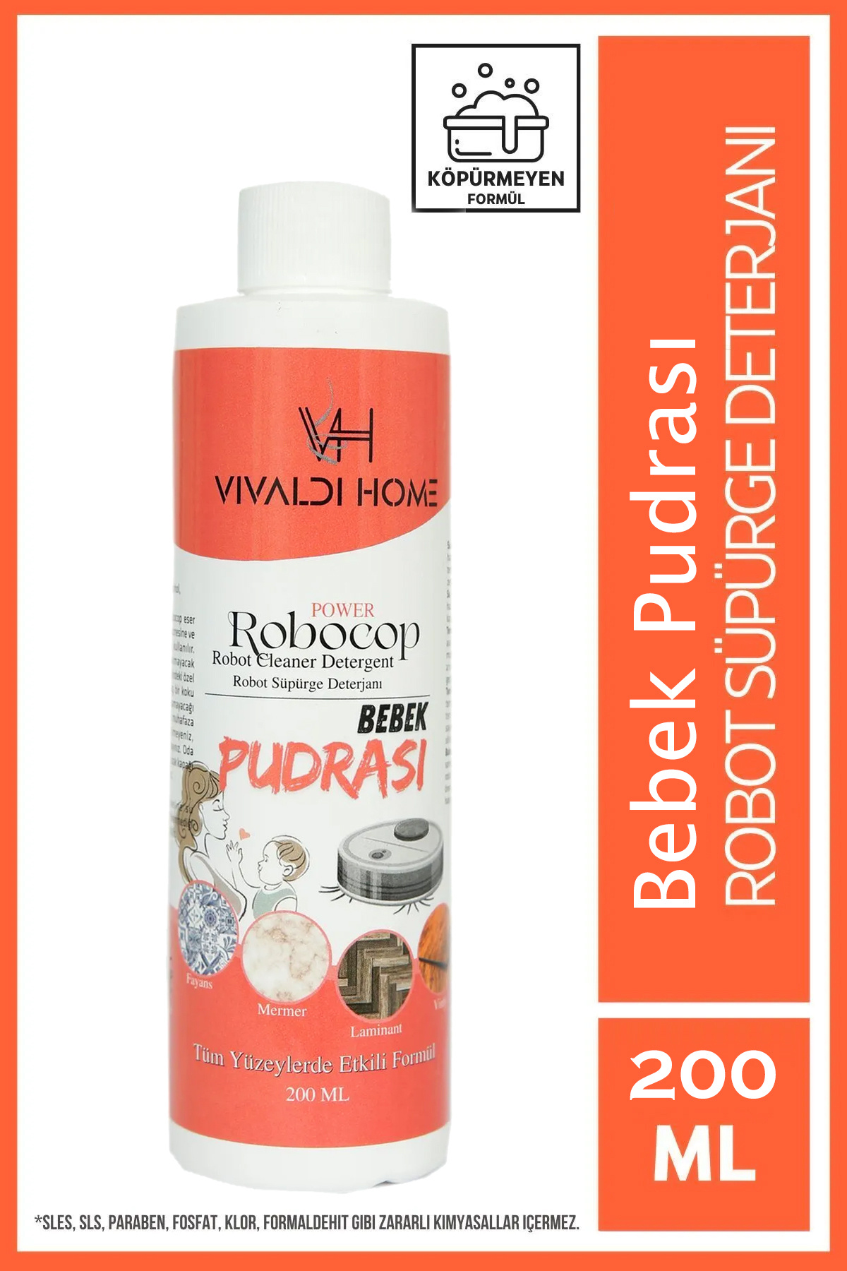 Vivaldi Home Bebek Pudrası Robot Süpürge Deterjanı Robocop Yüzey Temizleyici 200 ml Özellikleri