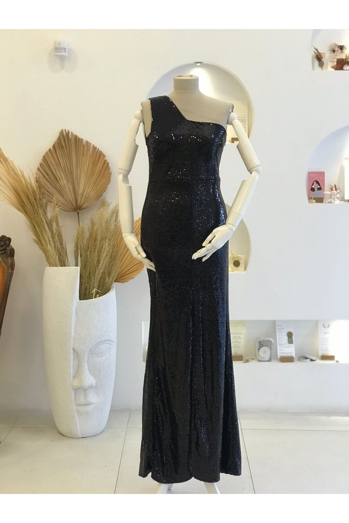 WEDDRESS Siyah Pullu Tek Omuz Uzun Abiye Elbise
