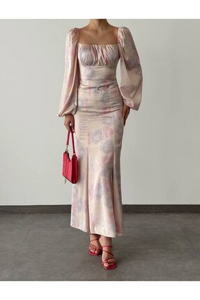 ETİKAFASHION Tasarım Saten Degaje Yaka Çiçek Detaylı Askılı Kadın Elbise